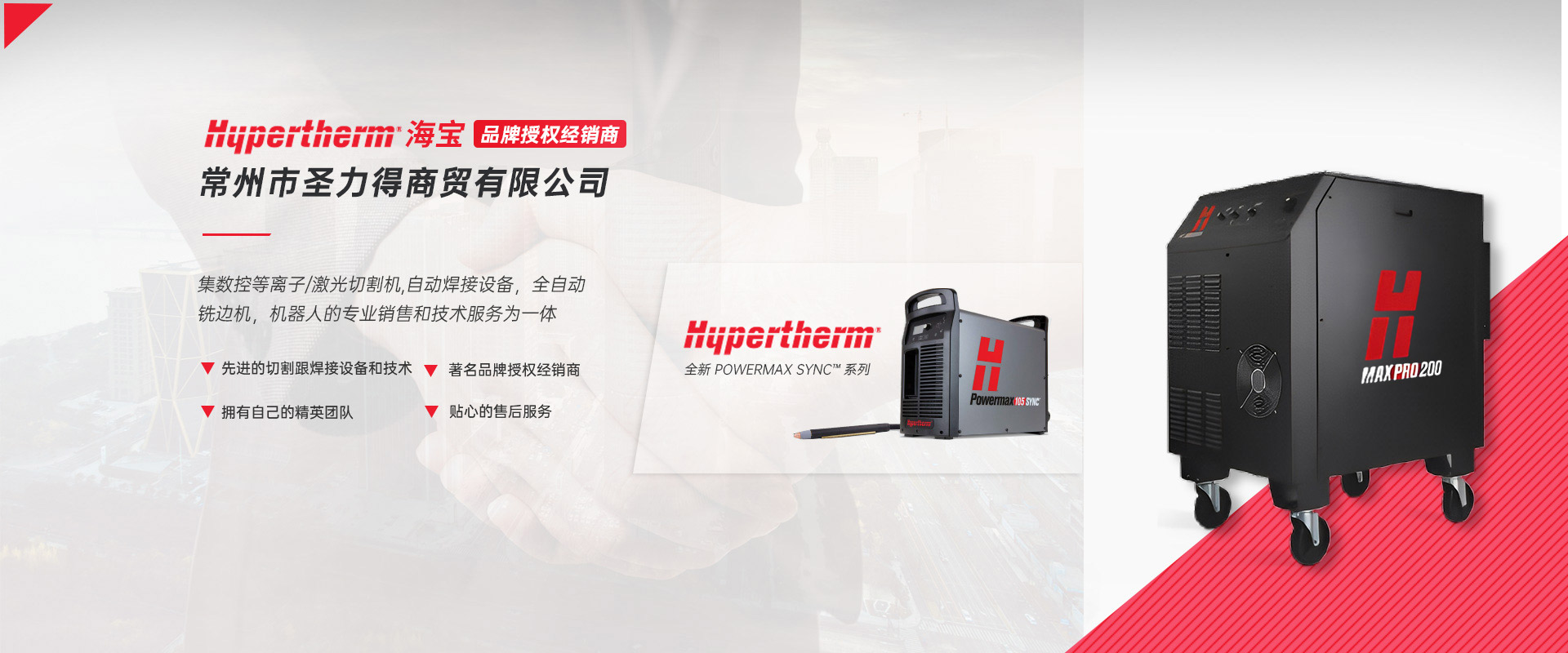 常州市圣力得商贸有限公司是一家集数控等离子/激光切割机,自动焊接设备,全自动铣边机,机器人的专业销售和技术服务为一体的公司。本公司是世界品牌Hypertherm(美国海宝)公司的授权经销商。  公司是一支技术稳定、服务优良、富有朝气的精英团队。公司致力于将国外先进的切割跟焊接设备和技术介绍给中国的机器制造商和终端用户,并为用户提供品质的产品和完善的售后服务?! 」局饕硪韵虏罚骸 ?.美国海宝Hypertherm等离子机用电源,手持电源,原装易损件及备件  2.韩国赛拉科(CERACO)铣边机,南京顶瑞自动焊接小车  3.迈誓坦(MicroStep),日本田中(TANAKA),武汉法利莱(FARLEY-LASERLAB),江苏博大品牌等离子切割机,激光切割机及维修配件?! ?.美国海宝,美国飞马特,凯尔贝等原装正品易损件及配件  5.激光切割机,等离子切割机,火焰切割机升级,安装与调试及技术升级改造项目  6.机器人焊/切生产线  热忱欢迎广大用户前来询价及洽谈。